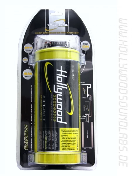egy kiváló minőségű, 6 farad-os, voltmérővel ellátott kondenzátor a német Hollywood Energetic márkától, amelyet az akkumulátoros működés támogatására és az autórádió-rendszerek tranziens stabilitásának javítására terveztek. Ez a kondenzátor hatékony energiapufferként működhet, hatékonyan és valósághűen stabilizálva a tranziens feszültségeséseket az autórádió-rendszerekben 2000 W-ig. A készlet tartalmaz egy további felső plexiüveg fedelet (második fedél), amely teljesen körülveszi a kondenzátor csatlakozóit, megvédve azokat a véletlen rövidzárlatoktól.